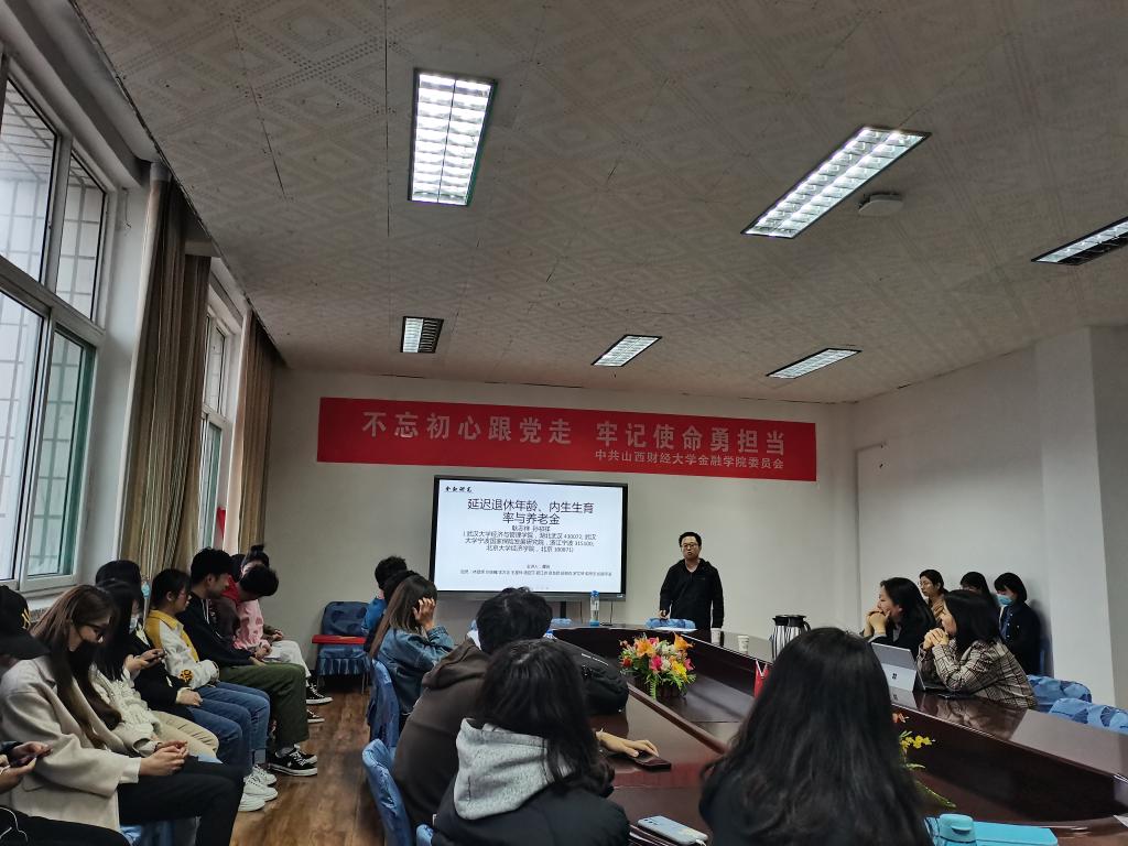 2020-2021学年第二学期第2期学术沙龙活动于2021年04月06日晚在学院会议室如期举行。本次沙龙主题为“延迟退休年龄、内生生育率与养老金”,由2020级保险专硕谭骁同学作为主讲人来为大家进行汇报讲解。此次学术沙龙很荣幸邀请到王华丽老师、闫丽瑞老师来担任讲评嘉宾。现场参加学术沙龙的有近80位来自情色论坛