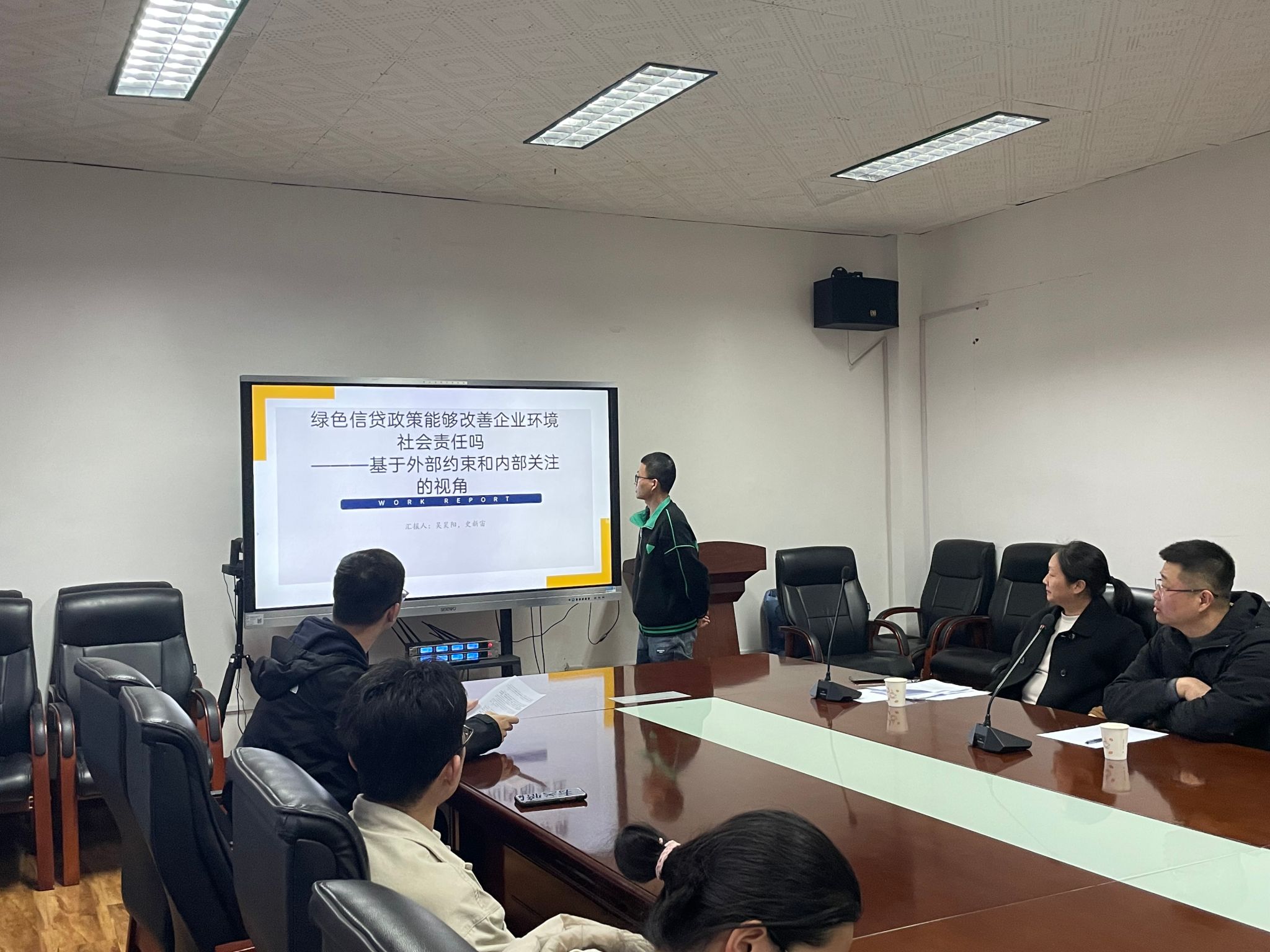 2022-2023学年第12期学术沙龙活动在王梦帆同学的主持下如期举行,本次沙龙的主题是"绿色信贷政策能够改善企业环境社会责任吗—基于外部约束和内部关注的视角",由2022级金融专硕班的吴昊阳同学和史新宙同学为大家作汇报讲解,本次沙龙有幸邀请到闫丽瑞老师和范瑞老师作为讲评嘉宾,参加这次学术沙龙的是2022级各专业学生。