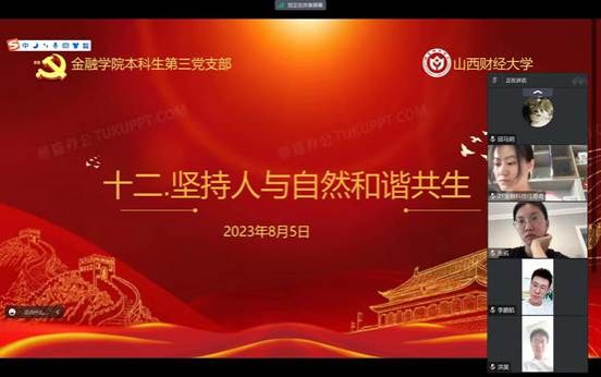 概要:情色论坛 本科生第三党支部在8月5日进行了第十二章和第十三章的学习,本讲的主要内容是“坚持人与自然和谐共生”和“坚决维护国家安全和社会稳定”,由本科生第三党支部预备党员张拓带领大家学习,本科生第三党支部邱马玥主持并总结发言。