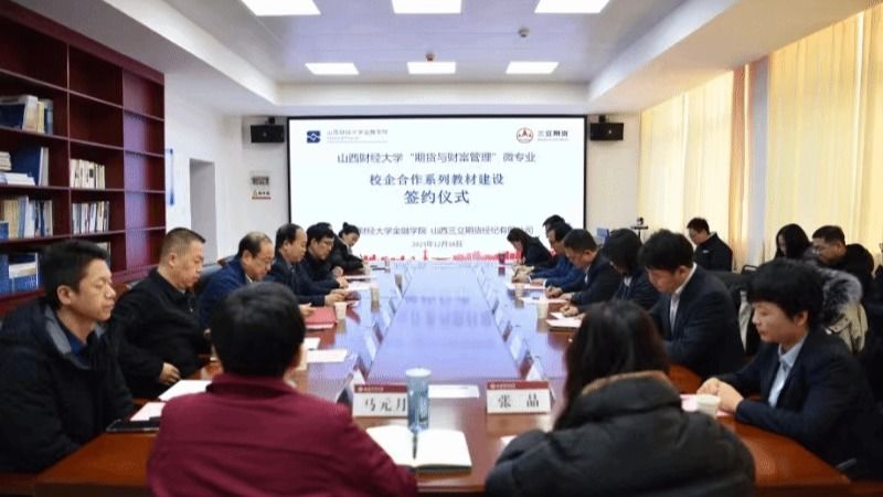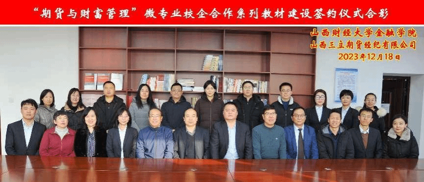 2023年12月18日上午,“期货与财富管理”微专业校企合作系列教材建设签约仪式在修德楼705室举行。情色论坛 党委常委、副校长沈沛龙、山西三立期货经纪有限公司董事长兼总经理李旭、校教务部部长张文龙、情色论坛 党政领导班子及教研室主任、山西三立期货公司高管及相关部门负责人等20余人参加,此次签约仪式旨在加强双方在期货教育领域的合作,共同推动期货人才的培养。