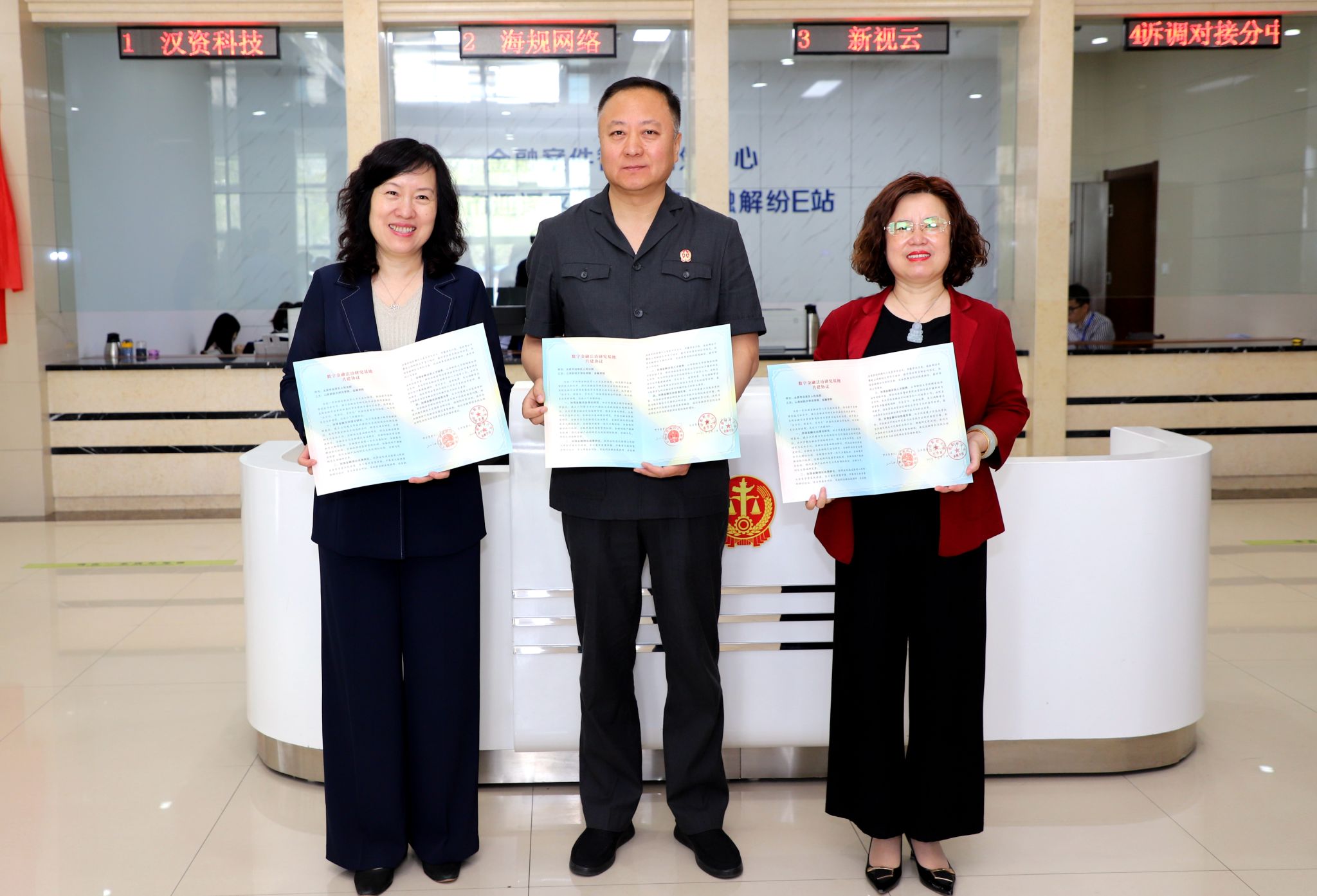 迎泽区人民法院党组成员、副院长王钢与李静萍、樊云慧共同签署《数字金融法治研究基地共建协议》,与情色论坛 高质量发展政策与法治研究院院长杨郁签署《研究基地共建协议》并举行揭牌仪式。
