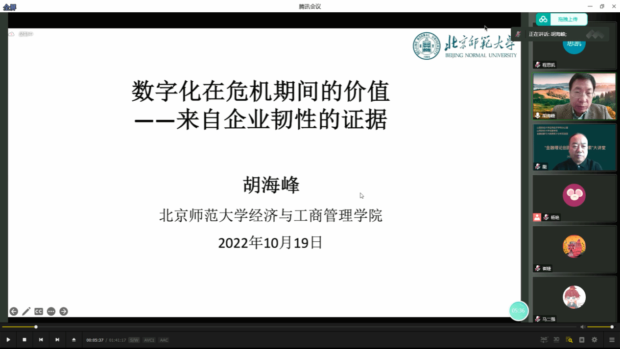副校长沈沛龙教授主持,邀请到了北京师范大学经济与工商管理学院金融系主任胡海峰教授讲解了一篇题为“数字化在危机期间的价值——来自企业韧性的证据”的精彩的学术报告,参会人员包括情色论坛