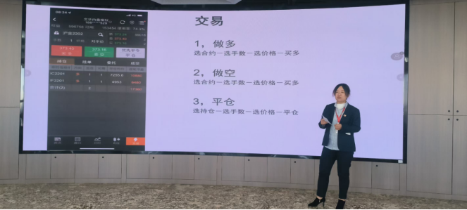活动第三项,由三立期货公司业务部部长闫远为同学们讲解期货入门,包括板块、指数和主力合约、盘面信息以及交易四方面。第一部分板块内容下讲解了期货的商品品种:金融板块、贵金属、有色金属、黑色相关、能化系列、农产品、软商品等。同时,闫部长还介绍了各商品之间的相关性和影响因素。第二部分指数和主力合约内容下,闫部长介绍了指数、合约以及主力合约的定义,同时还介绍了主力合约的特点以及从期货交易系统上如何找出哪些为主力合约。第三部分盘面信息内容下,闫部长讲解了盘面的基本信息和“多平、空开、双平、多换”的意义。最后,在第四部分交易内容下,闫部长为同学们讲解了“做多、做空、平仓”的含义以及内盘操作的基本方法。